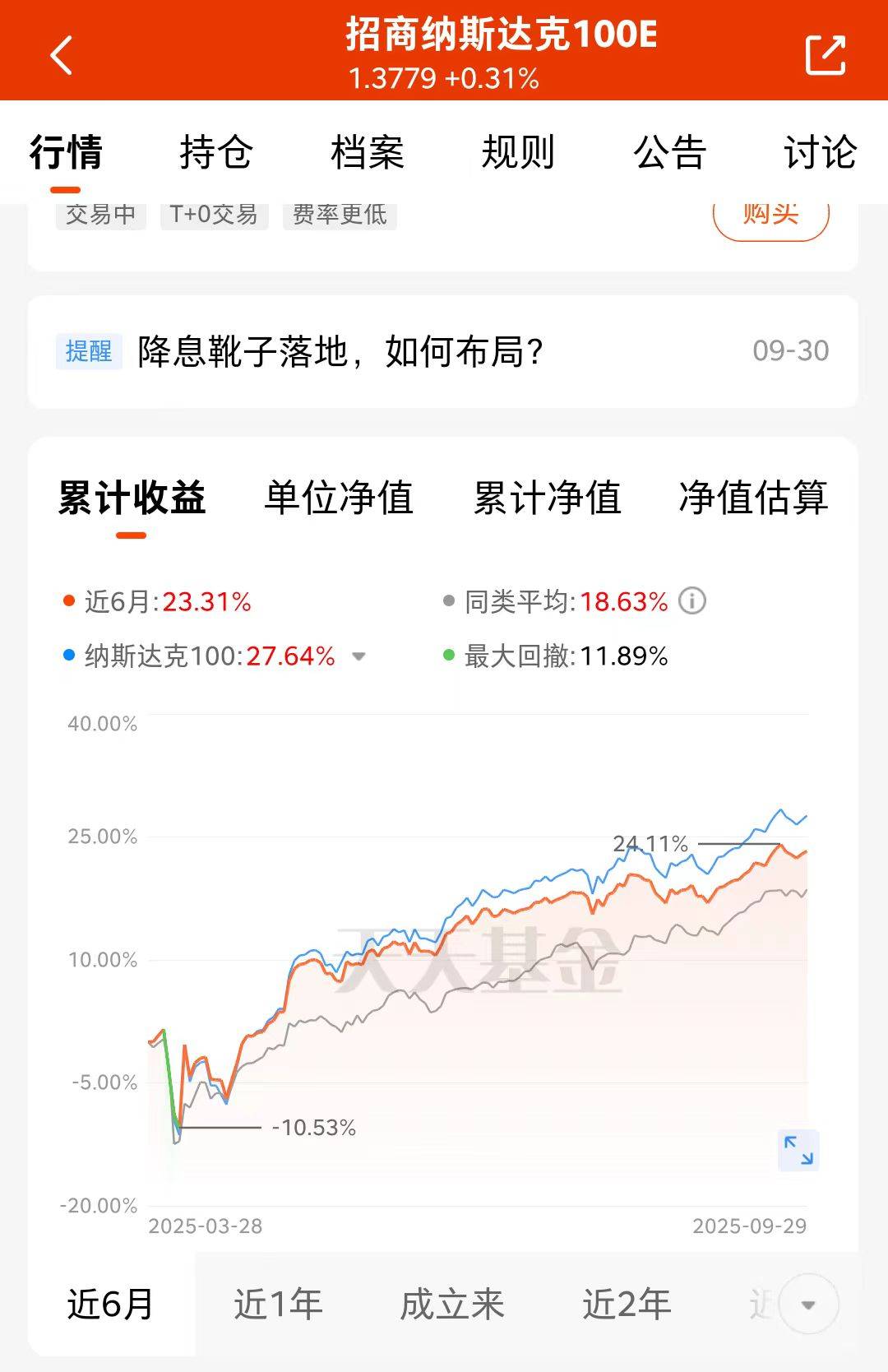 伙伴们,牛市行情中的长假有点让人着急,今天大盘指数高开高走节后补涨,但是在节假日期间$招商纳斯达克100ETF发起式联接(QDII)C(OTCFUND|019548)$,表现不错,创新高了呢。近半年上涨23.31%,美联储降息利好逐渐凸显,科技板块弹性大,上涨空间也大,可以加自选关注了,适时就上车。