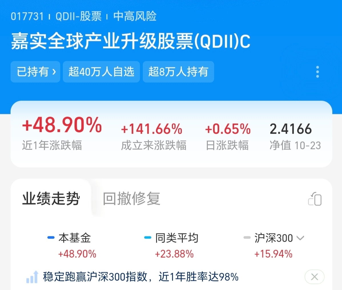 太好了,娜娜期货红了不少,全球科技走强, 行情不错,科技行业的发展势头比较明朗,嘉实全球产业升股票(QDil)C这类聚焦科技领域的基金表现非常不错。近半年涨幅达到64.640%,近一年涨幅48.9%,成立以来涨幅超过140%,在同类基金里的排名处于靠前位置。它主要投资全球范围内的科技产业升级相关标的,比如半导体、人工智能产业链上的企业。另外,这只基金的C类份额没有申购费, 短期持有成本相对较低。