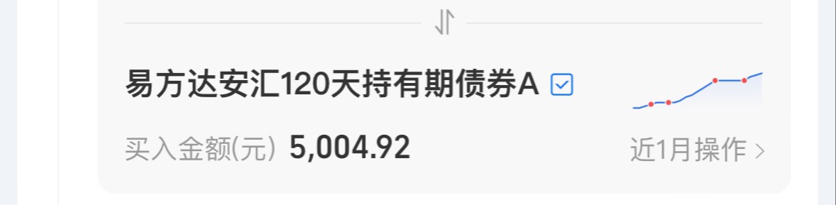 $易方达安汇120天持有债券A$ +5K。今天盘面上,信用债再度走出独立行情,以小晴天开局,利率债则呈现震荡态势。经过上周的回调,本周债市已逐渐企稳,叠加央妈连续大额净投放流动性以维护资金面稳定,呵护态度十分明显,这对债市构成利好支撑。在货币政策适度宽松的定调下,个人对下半年债市仍抱有较高期待。从持有体验来看,这段时间能明显感受到信用债更显稳定;利率债虽然上涨时弹性较大,但持续性欠佳,往往涨一天绿一天,持有过程中相对磨人。因此,我决定继续补仓易方达安汇——该基金采用“信用债为主+利率债辅助”的策略,核心特点是稳中求进。近一年3.98%的涨幅,也轻松跑赢货币基金和银行存单,今天继续定投一笔。
