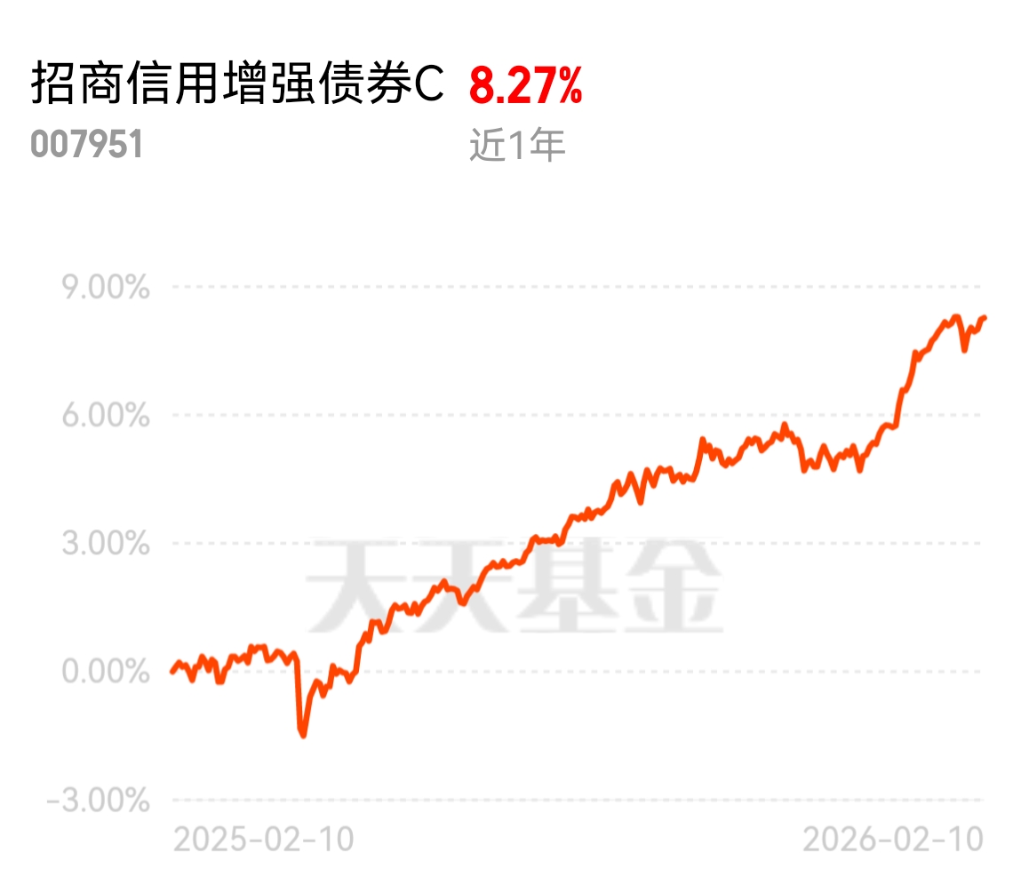 中波固收 + 里,招商信用增强债券 C 算第一梯队。近一年收益 8.27%,回撤才 2%,昨天涨 0.05%,收益稳波动小,做底仓妥妥的,当下位置正合适,继续布局。$招商信用增强债券C$