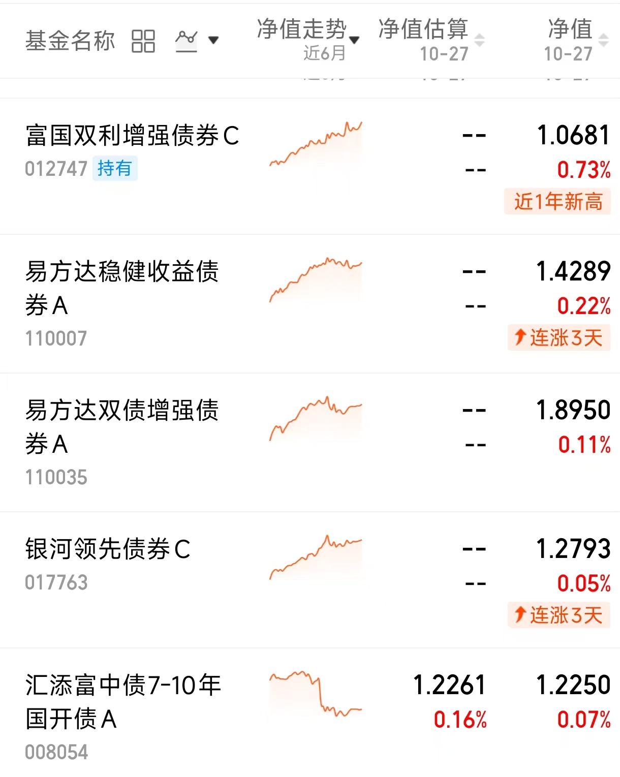 今天债市走得挺稳的,虽然股市分化得厉害,但债市这边持有体验确实舒服,看着账户心里踏实,这种平稳的行情在当下真的很难得。看看我的持仓$富国双利增强债券C$(012747)收了73个蛋,主要因为它的持仓里有色板块这几天表现特别好,隔壁的易方达双债增强债券A(110035)收了11个蛋,另外一个易方达稳健收益债券A(110007)收了6个蛋。这个双利增强固收+挺好,今天都创了近一年新高了,看二季报持仓增强部分主要做有色周期这些,而且它还有固收+本身的特性,波动小,很适合想参与有色行情又不想承受太大风险的投资者。#小金属概念狂飙!行情逻辑是什么?#