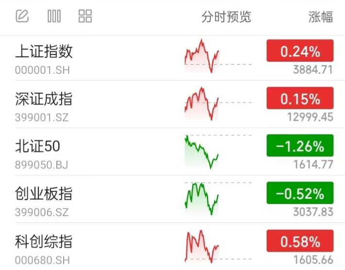 A股行情:截至中午,全市场各主流宽基指数涨跌不一,其中沪指微涨而创业板指小幅震荡。