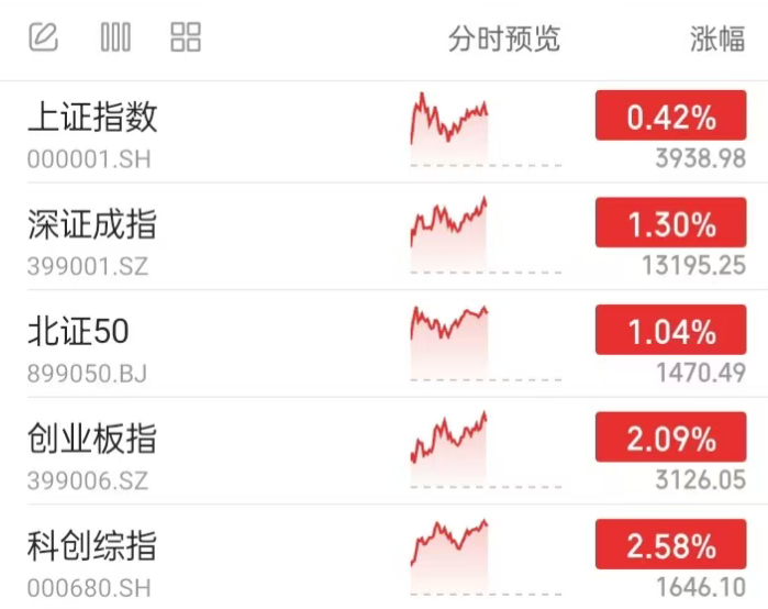 A股行情:截至中午,全市场各主流宽基指数全线上涨,其中创业板指以及科创综指涨幅均超过2%。