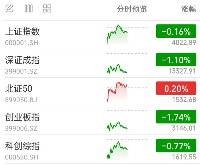 A股行情:截至中午,全市场各主流宽基指数多数调整,其中创业板指跌超1%。