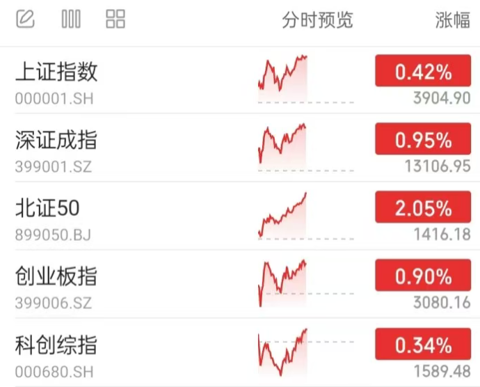 A股行情:截至中午,全市场各主流宽基指数多数上涨。