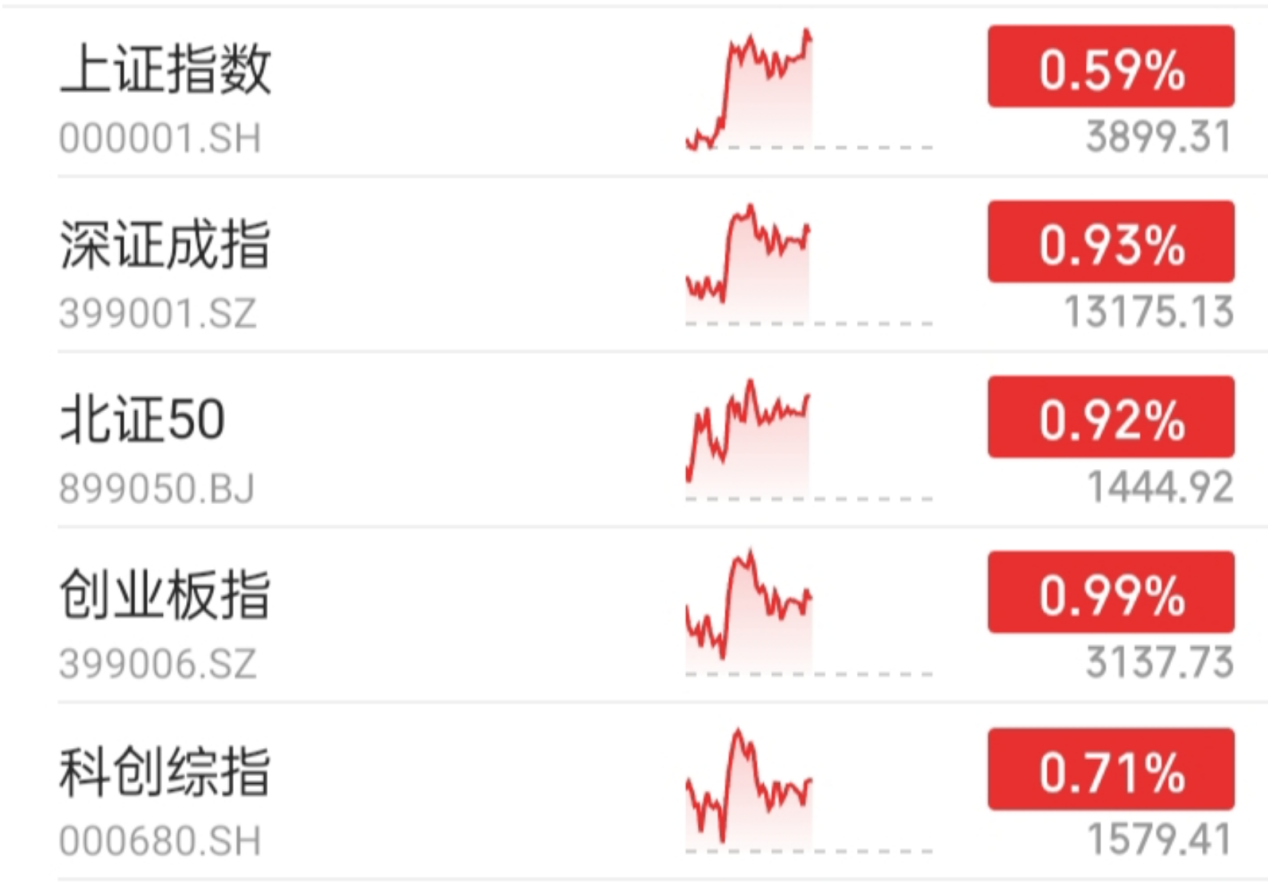A股行情:截至中午,全市场各主流宽基指数全线收红,创业板指涨幅近1%。