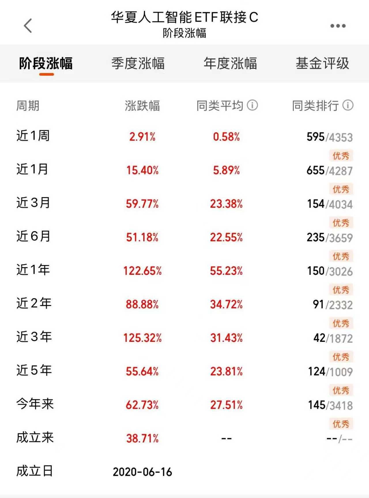 近期板块轮动,人工智能反复活跃,今日继续上涨近3%,$华夏人工智能ETF联接C$夏普比率高于96%同类,增长也好,多拿点