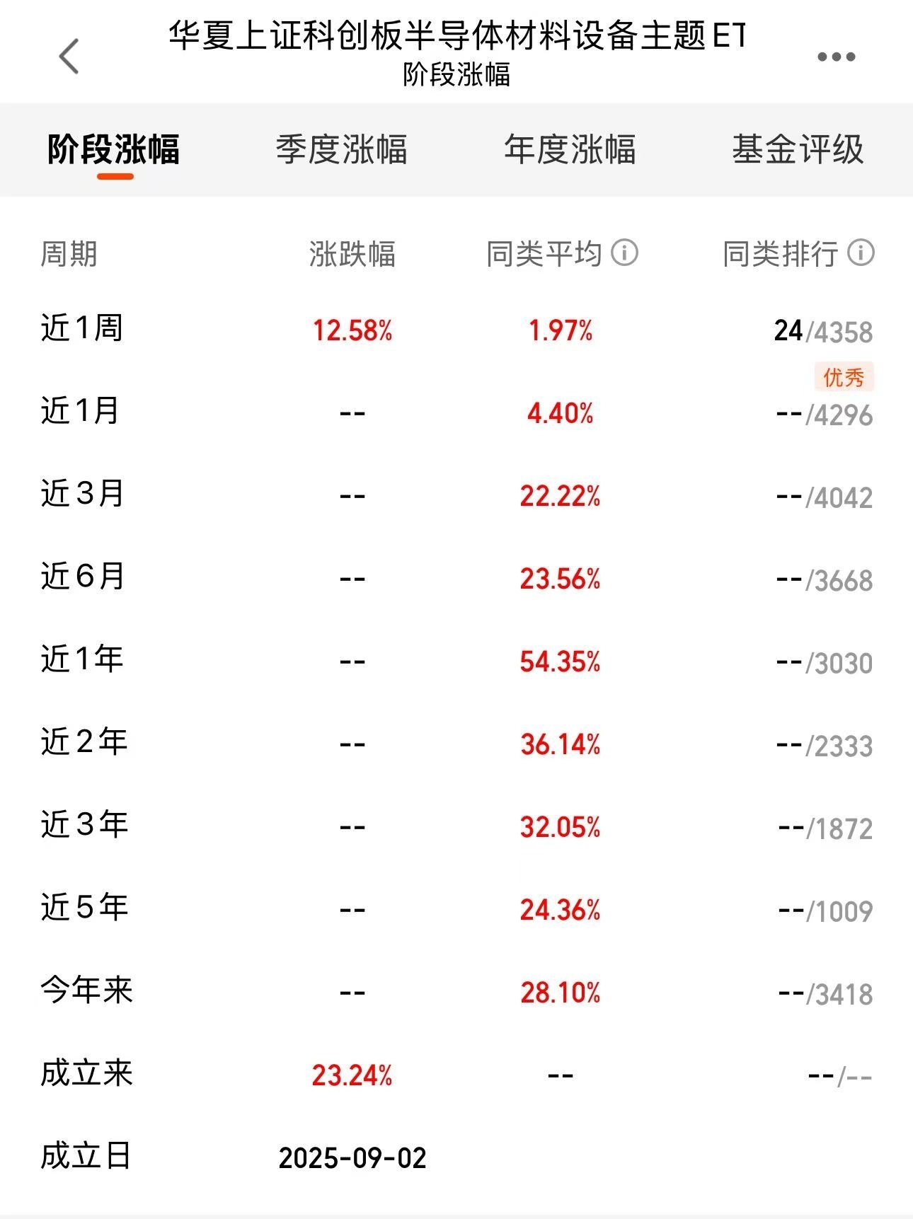 逆势反弹啊,还是喜欢这种增收能力强的新基,近一周收益12.58%,今天市场整体都在回调的时候也能抗住,$华夏上证科创板半导体材料设备主题ETF发起式联接C$反弹能力强