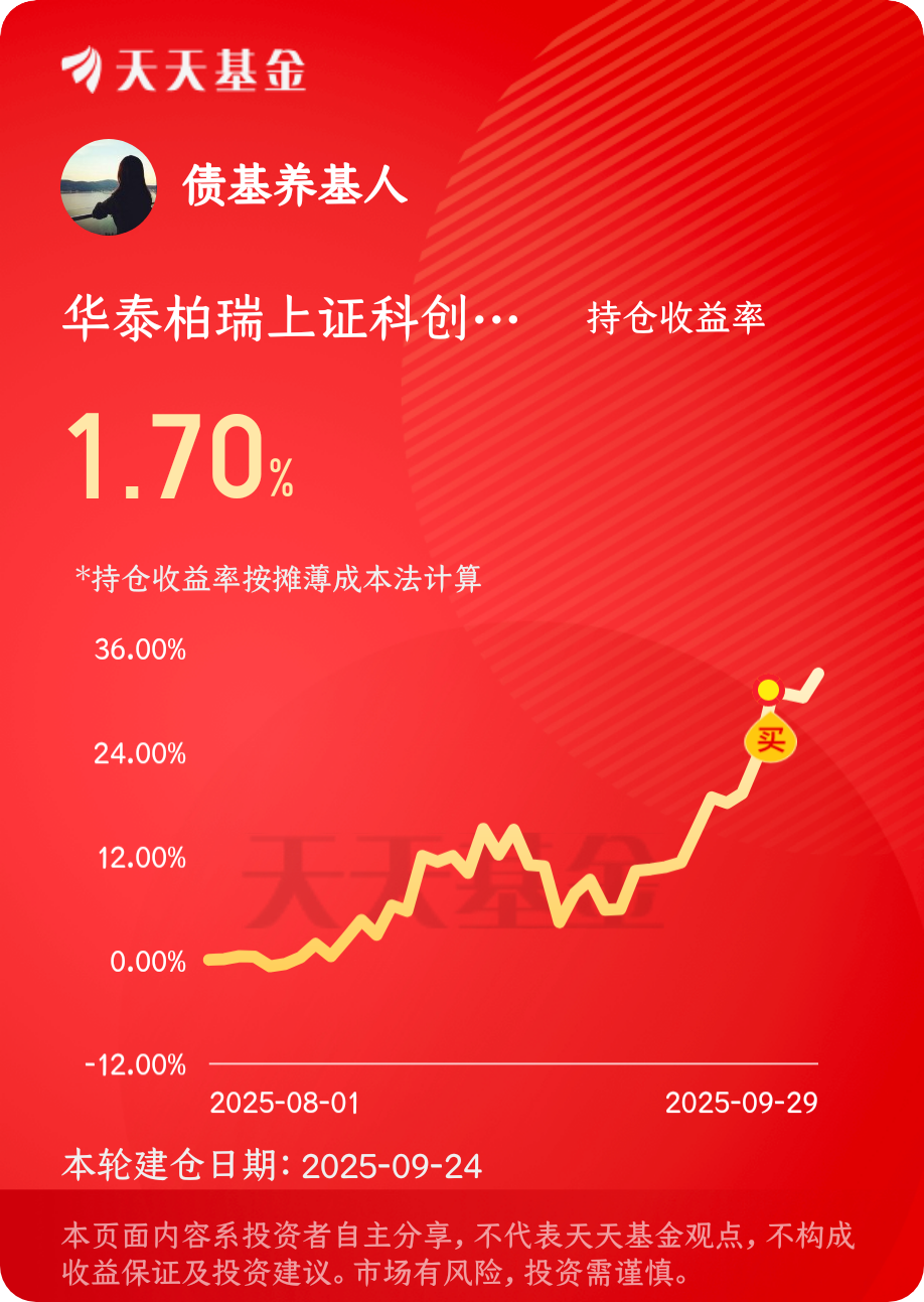 看到$华泰柏瑞上证科创板半导体材料设备主题ETF发起式联接C$ 今天估值涨了1.81%,近一个月涨了11.61%,半导体设备板块再次领跑,这收益很满意。#晒收益#