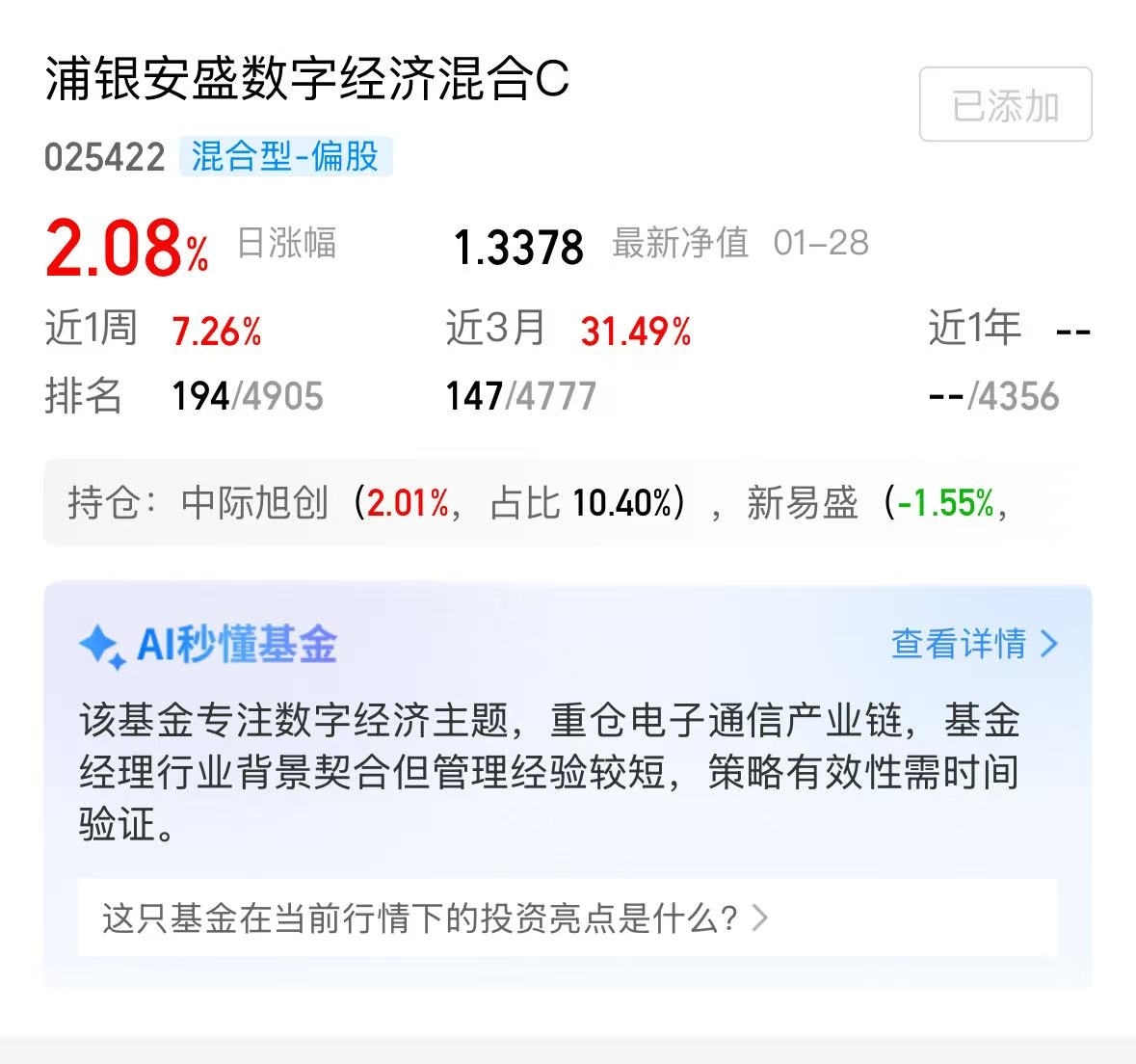 主动基布局CPO更专业,浦银安盛数字经济涨2.08%给出答案$浦银安盛数字经济混合C$