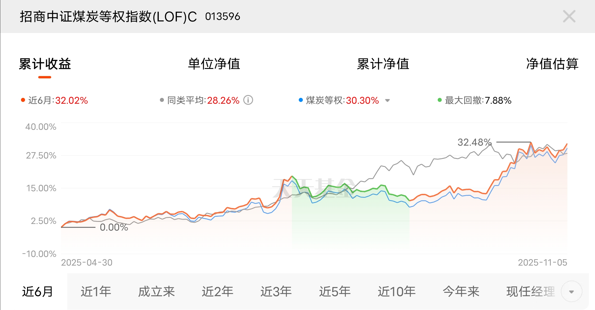煤炭板块的估值还没到高位,还有很大的上涨空间,现在布局正当时。招商中证煤炭等权指数C昨日日涨幅1.88%,近6个月涨了32.02%,低估值+高成长,这样的投资机会很难得,别错过。