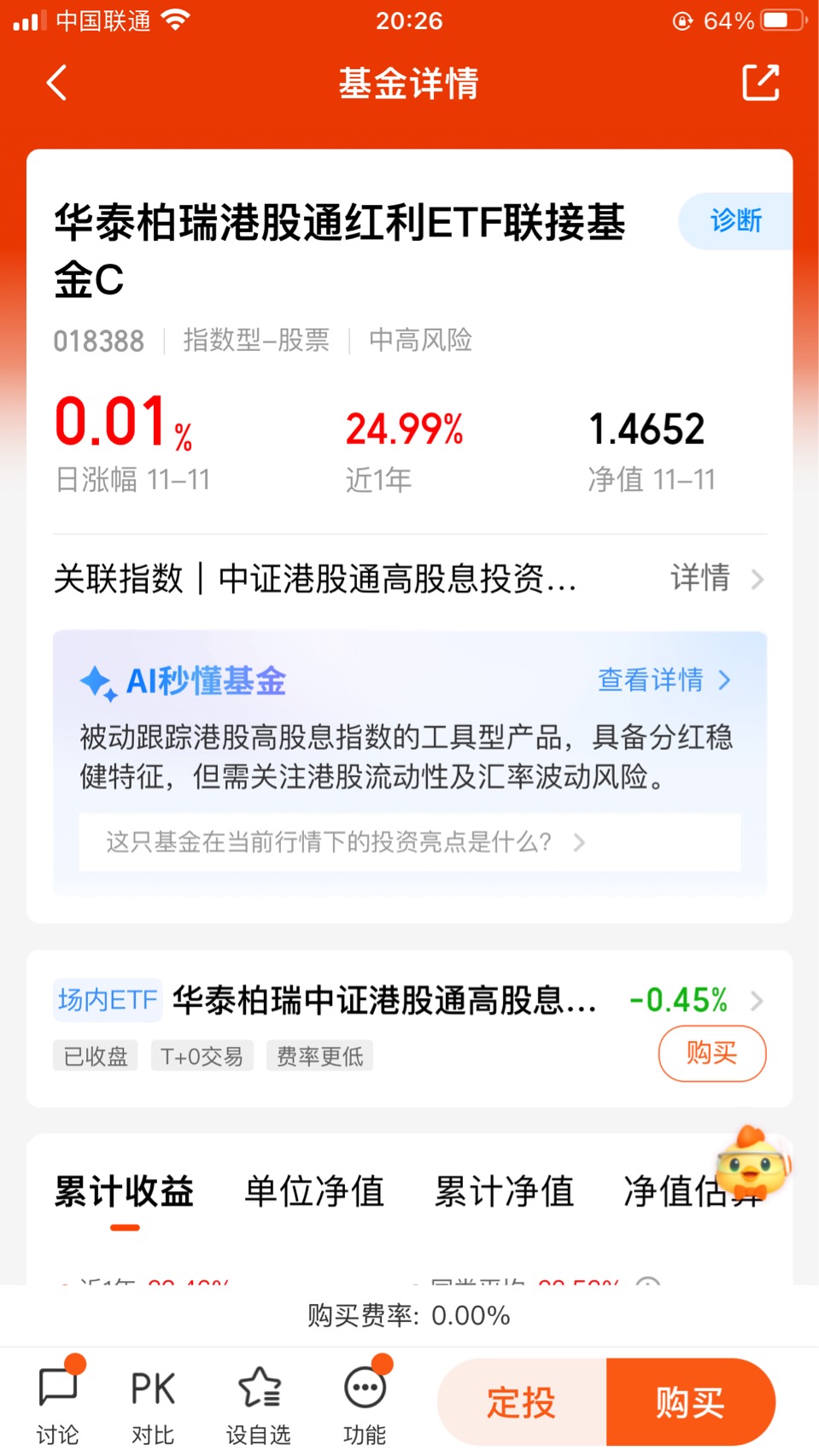这港股行情真是没个准儿,上午还飘红下午就翻绿,天天盯着盘手心都冒汗!马上四季度了,我可不想把今年赚的那点钱再赔进去。思来想去,还是转投红利方向靠谱——华泰柏瑞刚好是做港股红利的,本身就靠分红稳,现在换过去正好能把今年的收益守住。毕竟行情波动大的时候,“稳”比“贪”强,先把口袋里的钱攥紧了再说!$华泰柏瑞港股通红利ETF联接基金C$ #科技小登大揭秘#
