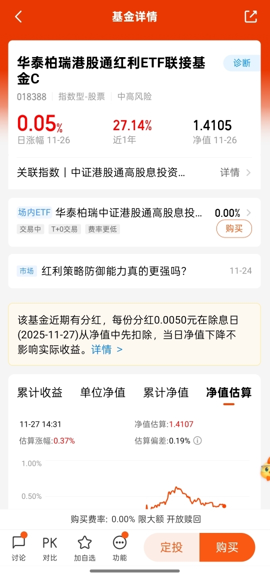 最近聊投资,港股红利绝对是绕不开的热门!现在市场追求“稳稳的幸福”,港股红利刚好踩中这个需求——不仅分红稳定,行业结构还特别稳健,多是公用事业、电信这类受经济周期影响小的板块,抗跌能力拉满。加上南向资金年内净买入额已经突破万亿,源源不断的资金流入,让这个行情更有支撑力。华.泰.柏.瑞这款产品就是拥抱这个行情的好选择,作为ETF联接基金,能方便普通用户参与港股红利机会,不用直接折腾港股交易,操作简单。而且它是被动跟踪指数,不瞎折腾调仓,C类份额持有久了赎回费也划算,很适合想长期稳稳拿收益的需求。需要注意的是,基金过往表现不代表未来收益,投资需谨慎,还要留意境外市场相关风险~