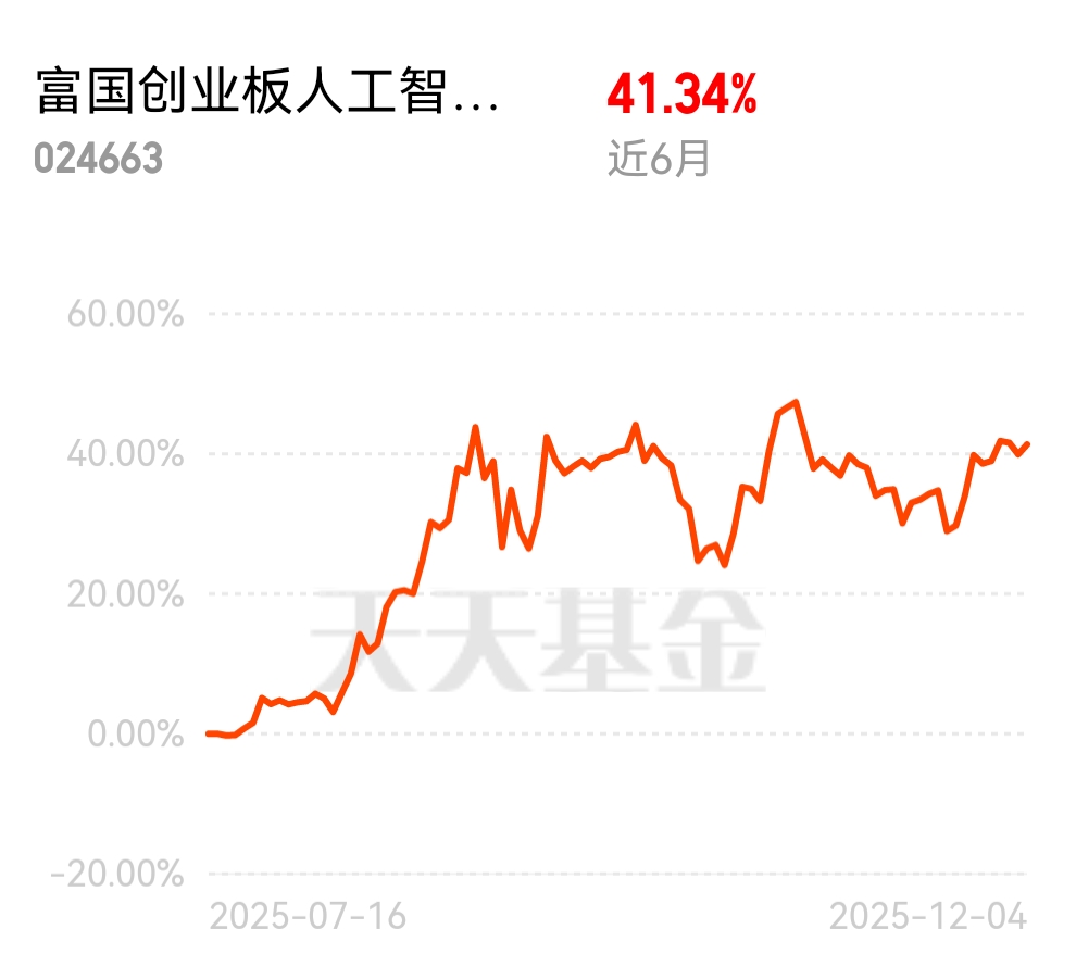 近期看广发中证香港创新药ETF联接C横着走,倒更留意手里的富国创业板人工智能ETF联接C近6个月涨了41%,周、月、季都超越同类,回本最快只要6天;背后是谷歌TPU推动ASIC架构普及,光模块用量比GPU高3倍多,英伟达明年年中才出下一代,窗口还在。这指数当前价格比过去五年37%的时间都便宜,对应2026年嬴利估值不到20倍,配置起来挺划算。