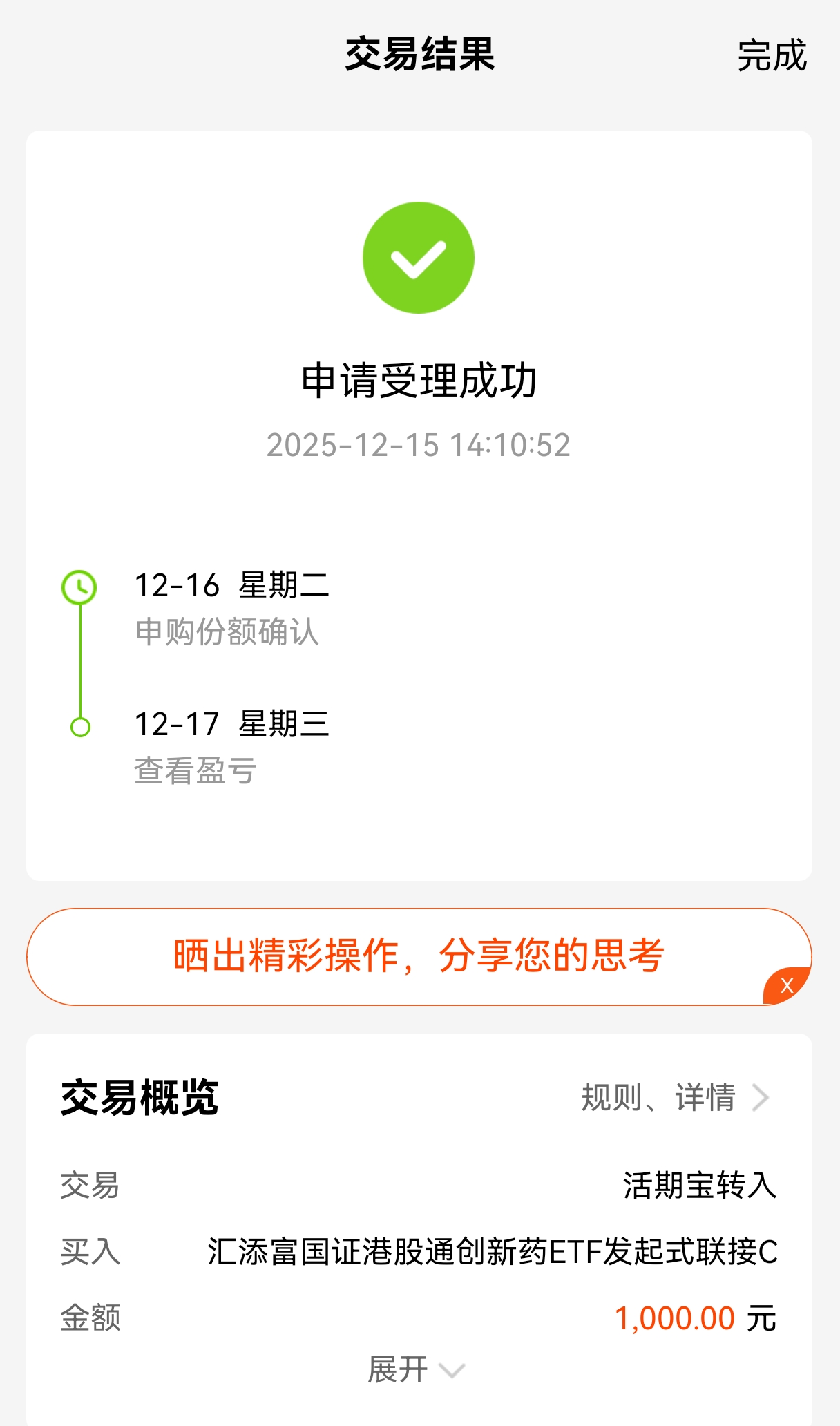 港股创新药自9月以来进入横盘震荡期,弹性相对变为平稳,趁回调,这时候提前埋伏博反弹就对了,今日继续加1000$汇添富国证港股通创新药ETF发起式联接C(OTCFUND|021031)$,这里面100%创新药含量,近一年涨幅62.54%,趋势还是可以的,这里面前十大重仓股全面覆盖港股创新药产业链领军企业,持仓占比集中且逻辑清晰。