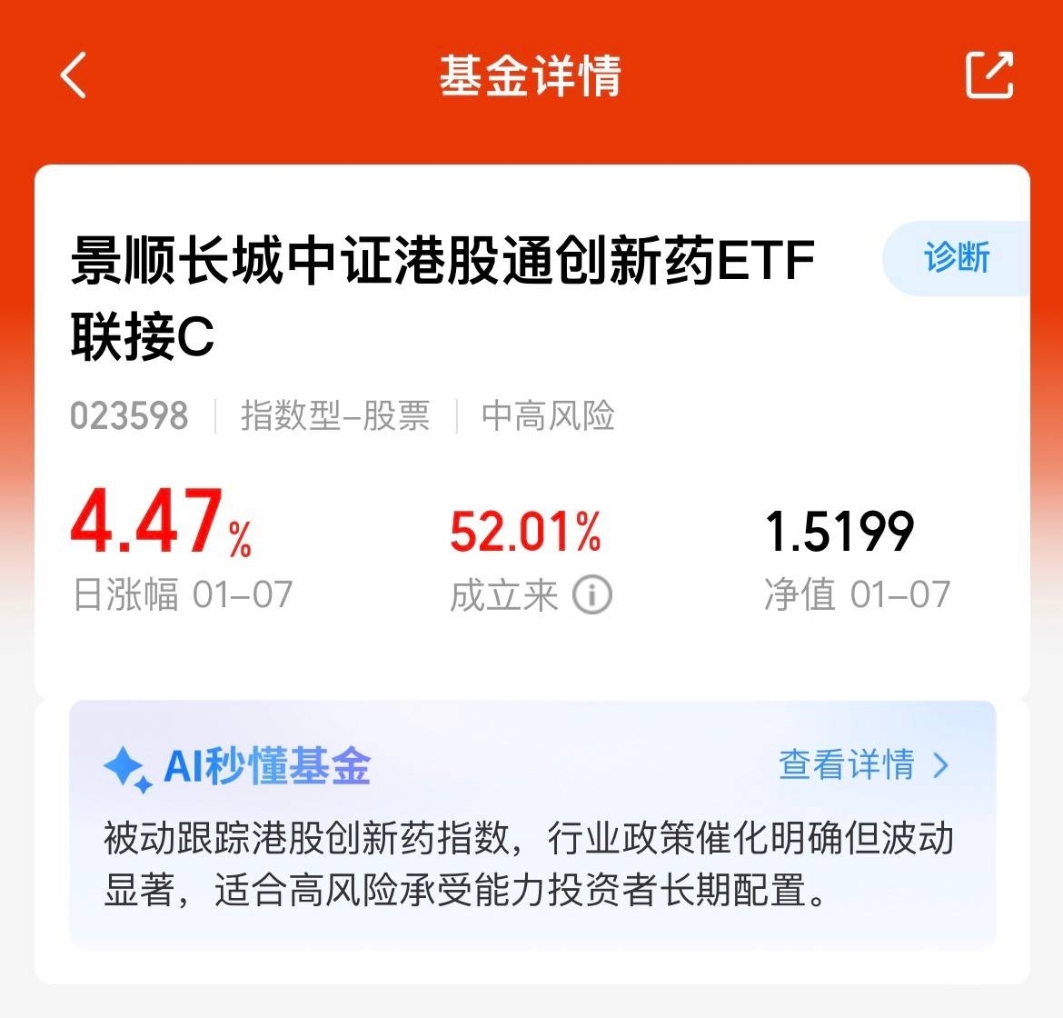 最新市场动态:创新药持续领跑医药,开年涨幅超 12%,是药里涨得最好的,政策护航 + 新药上市。景顺长城中证港股通创新药 ETF 联接 C 近 6 月 13.95%,单日涨幅跑赢恒生生科、恒生医疗,今天估值回调,短线加仓正合适,7 免做波段超省心。
