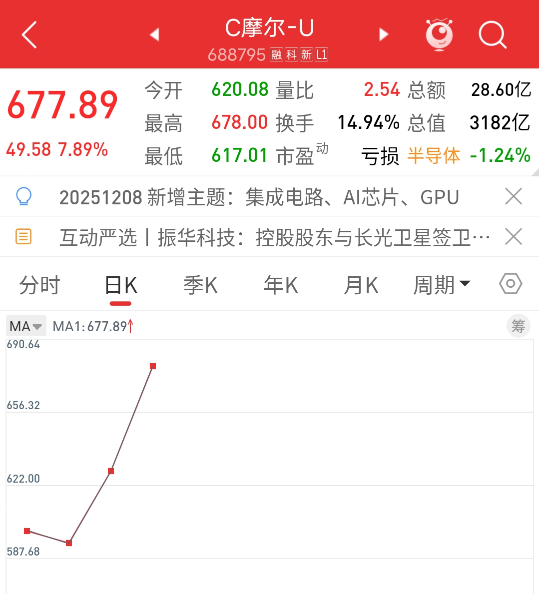 今日摩尔线程在大盘异军突起,我看到的时候成交量达到了28亿,交易异常活跃,当时才百分之七现在都百分之九了,这是要奔涨停使劲