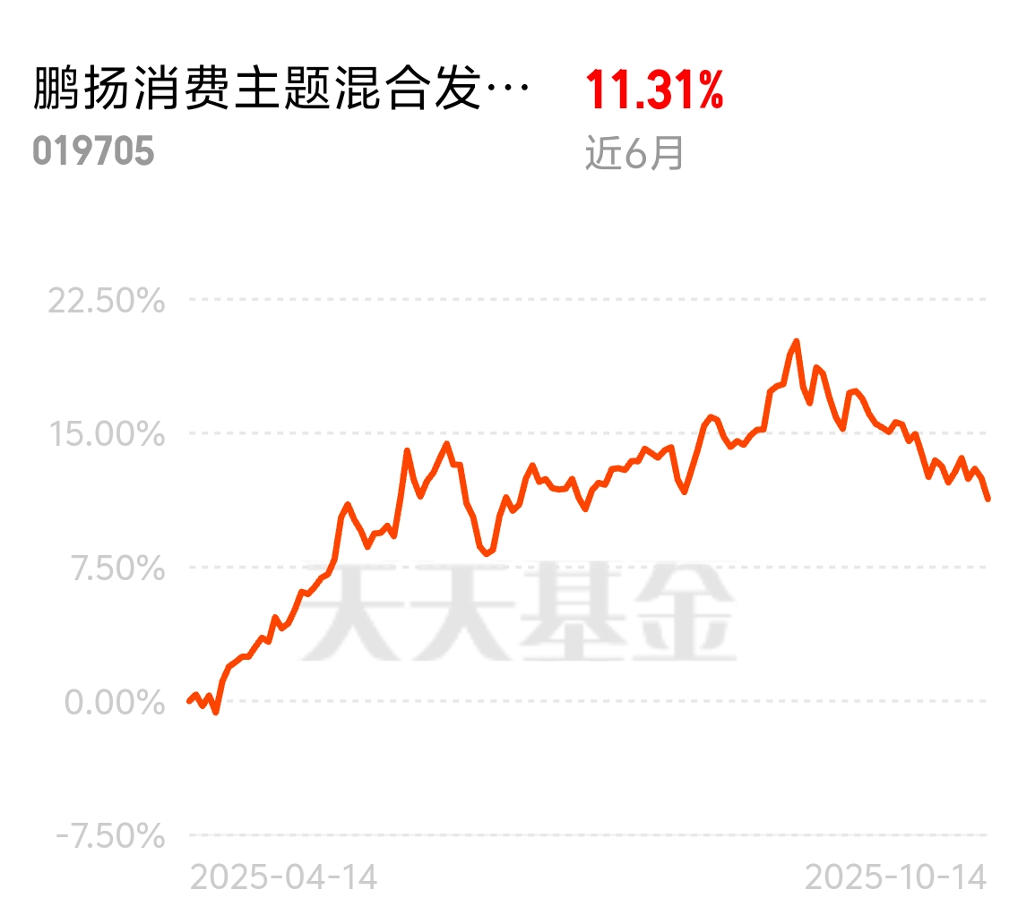 消费的行情还会持续,本身具有配置价值,还有低估值的优势,非常不错$鹏扬消费主题混合发起式A$