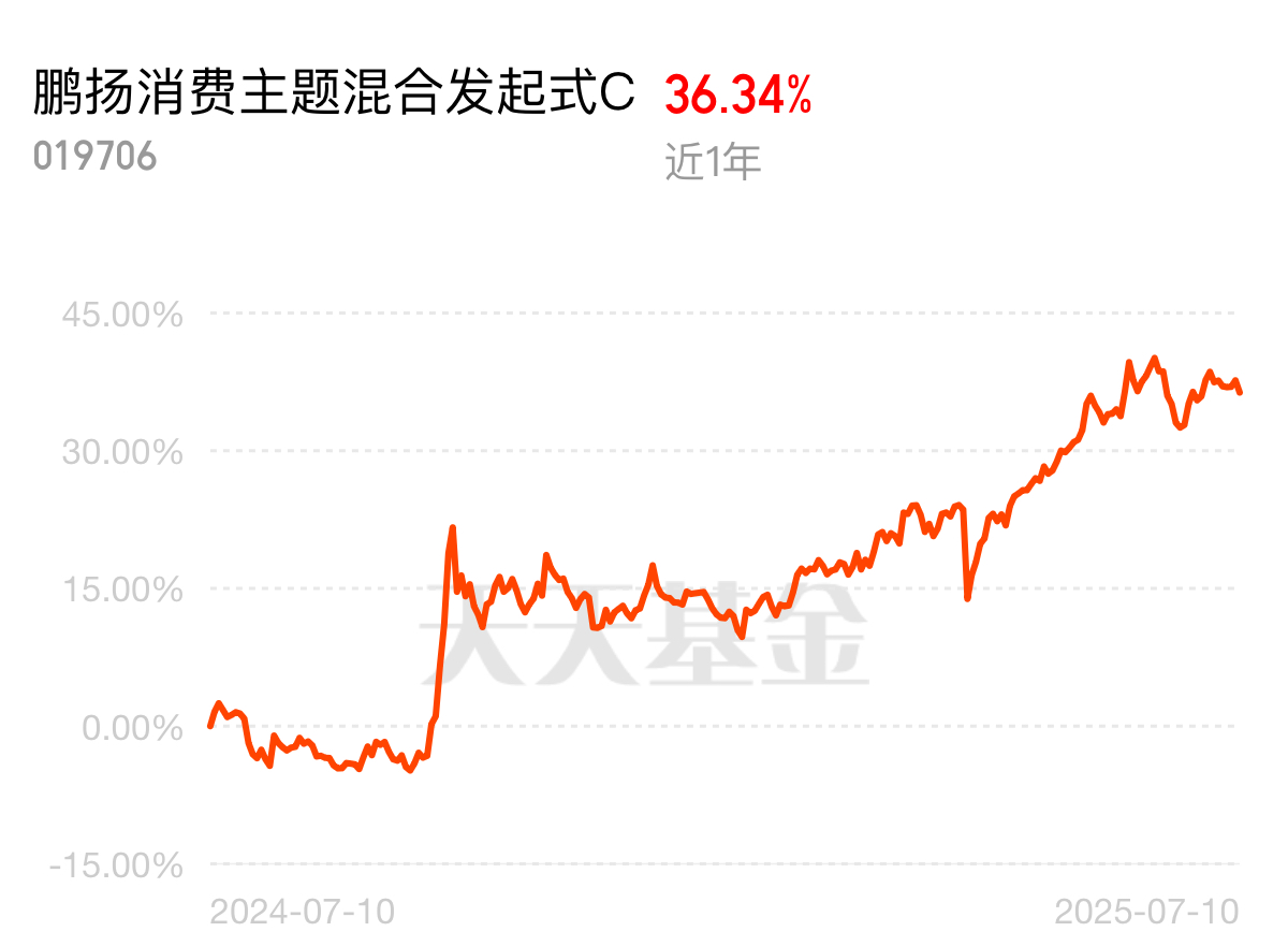 消费板块今天大涨,A股三大指数午间集体上扬,我依然十分看好消费板块。$鹏扬消费主题混合发起式C$ 近6个月涨幅达到23.45%