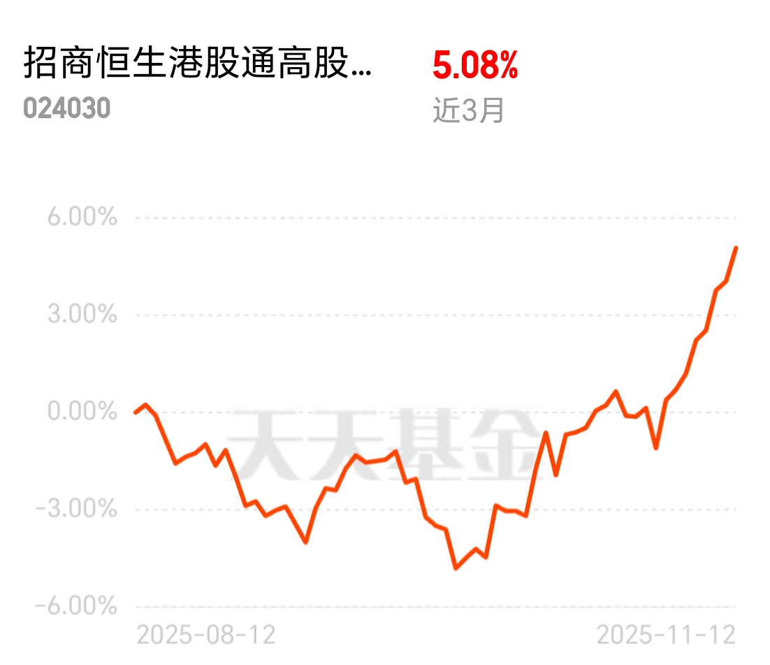 市场震荡行情下,抗跌且有稳定收益的产品稀缺,高股息低波动资产成了抢手货。招商恒生港股通高股息低波动ETF联接C近3个月收益5.08%,指数低波动特性显著,股息率达6%,金融地产权重超60%,低费率+定期分红,长期持有很合适。