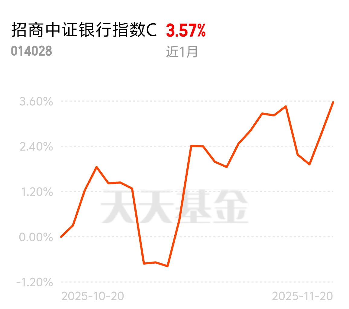 金融板块里银行的抗跌性越来越突出,低估值+高股息的优势很明显。招商中证银行指数C没让人失望,近1个月涨3.57%,昨日又涨0.82%,不用费心选个股,就能分享银行行业的红利,省心又靠谱。$招商中证银行指数C$