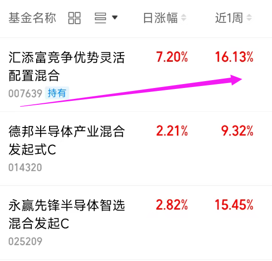 家人们,26年开年前三个交易日的全场最佳,那必须就是半导体,连续领涨三天啊,真是太牛了!今天小幅调整,跑步进场,加了$汇添富竞争优势灵活配置混合(OTCFUND|007639)$,这只基金昨天大涨7.2%,远超永赢先锋半导体,周二+3.37%,周一+4.80%,每天涨幅都很不错,近一周+16.13%,买到这个真是太香了!