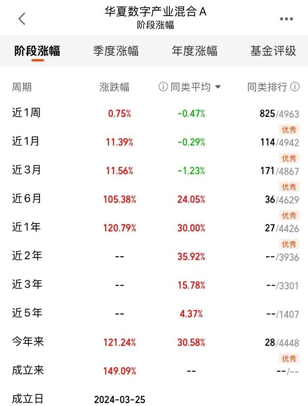各阶段表现在同类中都是优秀,看好这基的短期爆发力,昨日单日就涨了近6个点,牛啊!重点投海外算力,需求不断,后续肯定还有大行情的,拿稳了$华夏数字产业混合A$