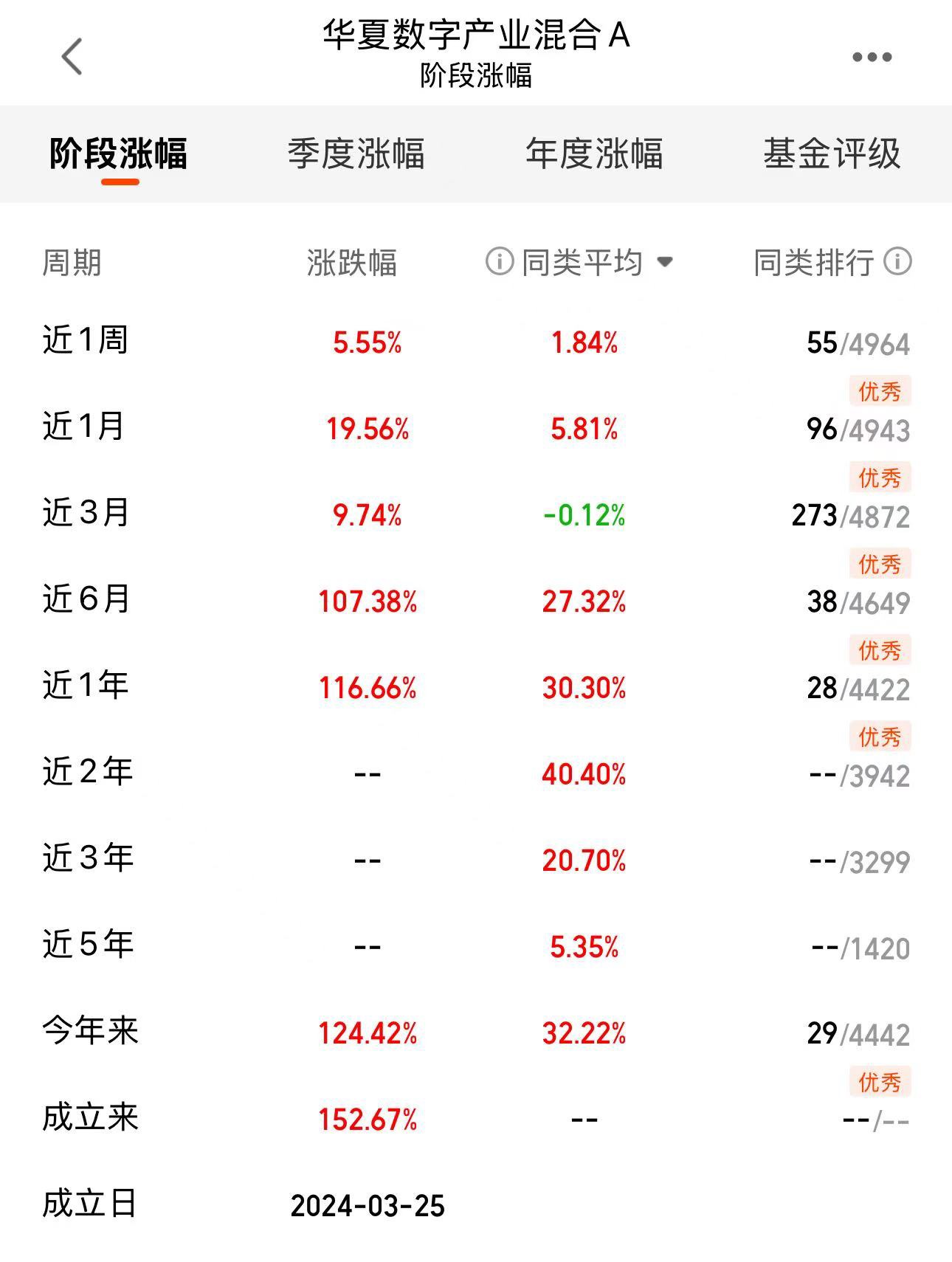 半年收益107%+,各阶段收益表现都很优秀,排名也靠前,昨天大涨5个点我一点也不意外,给机会我还继续买,期待继续新高哈$华夏数字产业混合A$