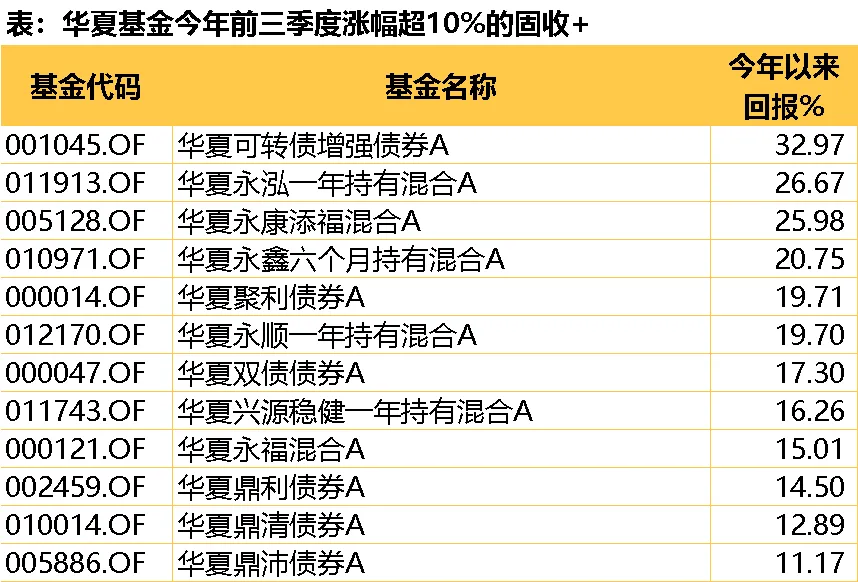 “固收+”领域:及时捕捉股市上涨收益,华夏可转债增强债券A年内回报达到33%,87%的产品在三季度创净值新高。(数据来源:Choice,截至20250930,“固收+”系列包括偏债混合型基金、二级债基、一级债基,只统计A份额)