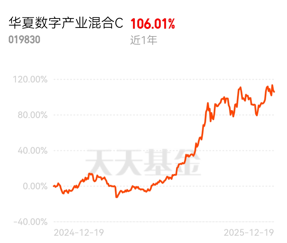 这基目前冲得不错,趋势越来越好,不亏是六个月就涨了95个点的大牛基呢,所有阶段表现在同类产品中均为优秀,我看找机会还是要再多布局一些$华夏数字产业混合C$