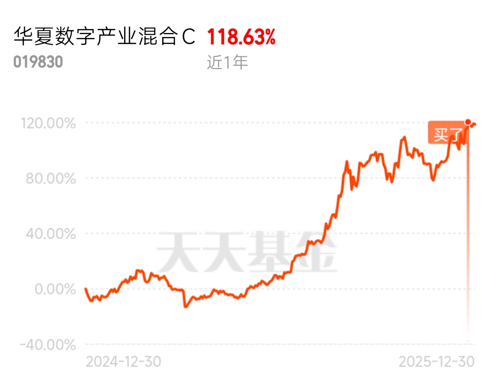 这波黄金我没吃到,因为它太受国际消息面影响了。涨太快怕摔倒。华夏数字产业混合 C (019830)精耕数字产业,长期以来业绩稳定上升,近一年收益超过118%,不纠结了就选它!