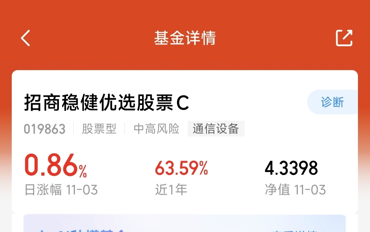 昨天市场探底回升。指数集体反弹。但是板块分化还是比较大。科技目前整体还是不太强。但是$招商稳健优选股票C$ 这是主动的混合科技基金。依然做到稳定上涨0.86%。同类基金涨幅继续领先。近一年涨幅63.59%。整体表现也是涨多跌少。期待反弹,继续创新高。