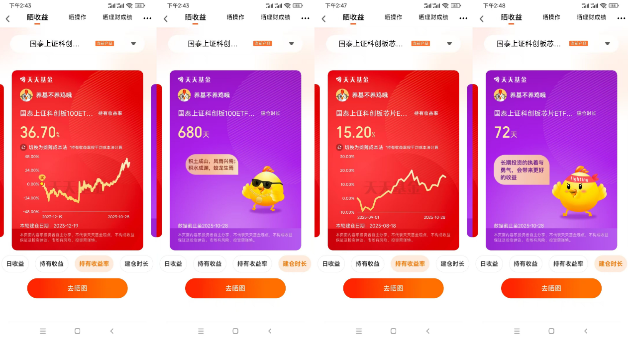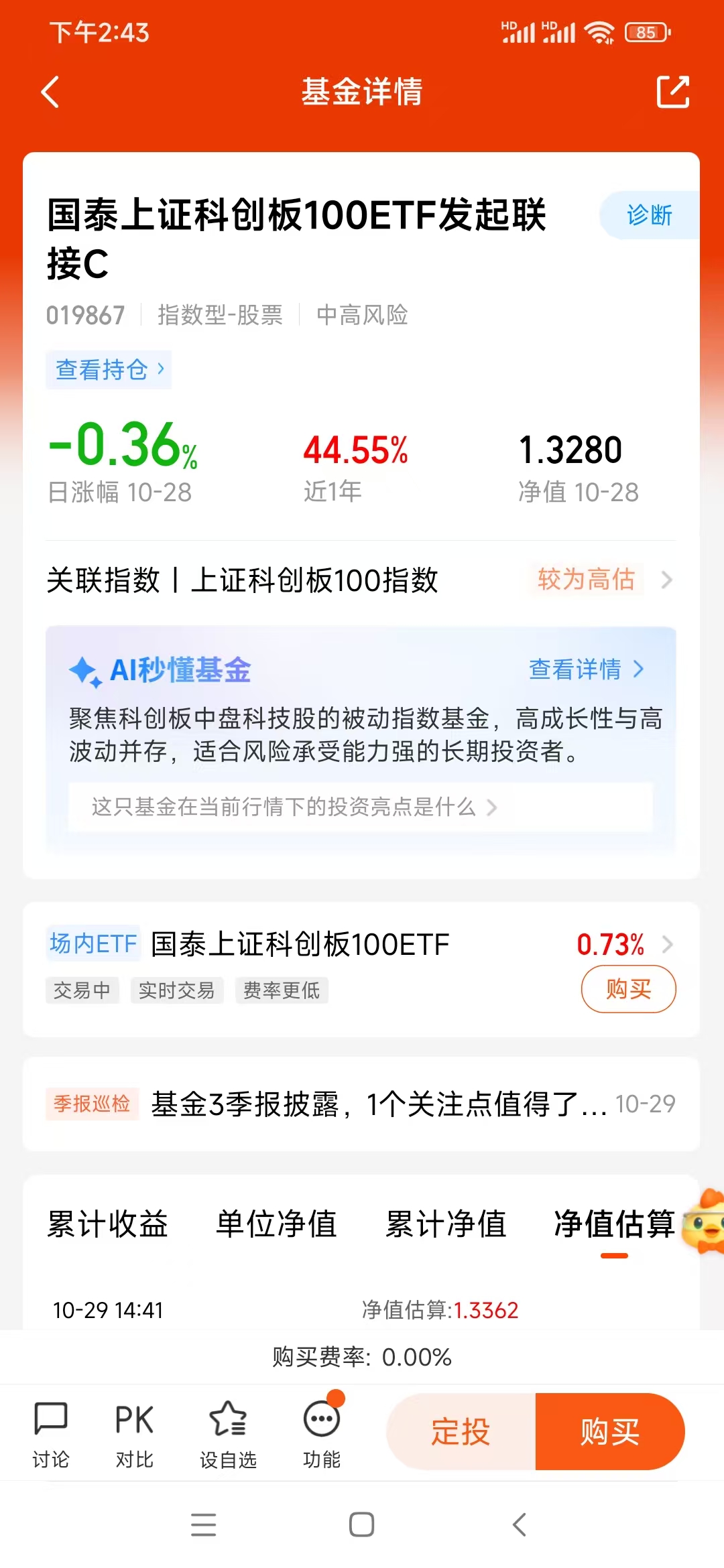 我是国泰基金的老粉儿了,一年多之前买入了您管理的国泰上证科创板100ETF发起联接C(019867),目前持基收益率为36.70%,而在今年8月我又买入了国泰上证科创板芯片ETF发起联接C(024854),目前持基收益率为15.20%,这支场外基金对应场内ETF即国泰上证科创板芯片ETF(589100)也是您管理的,感觉跟您太有缘分了,所以忍不住向您请教一些问题: