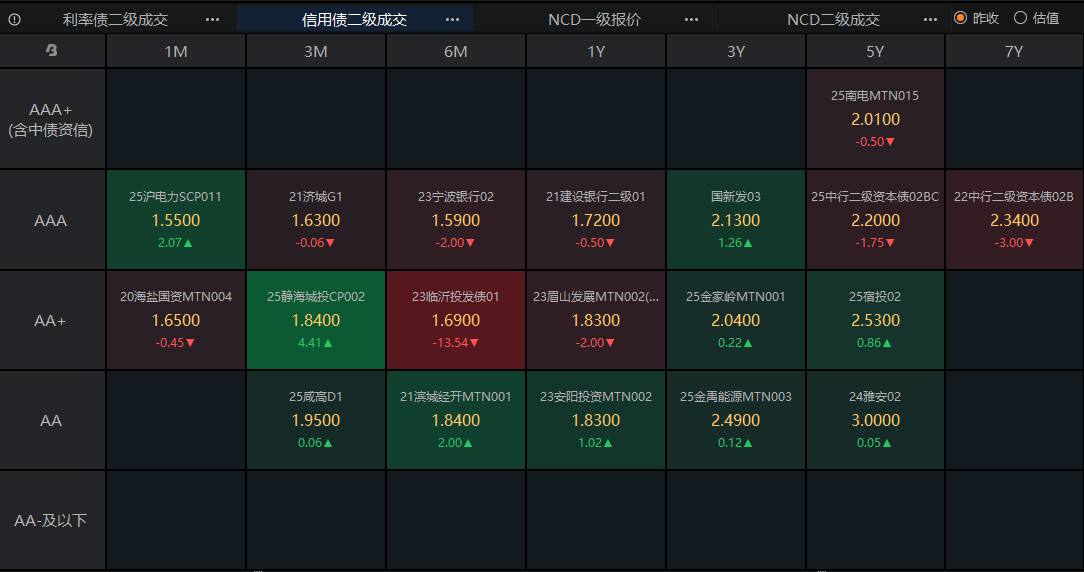 从成交矩阵图来看,利率债的表现还是比较亮眼的,虽然目前收益率下行幅度不算特别大,但是今天利率债没有出现明显的分化,保持全面上涨。