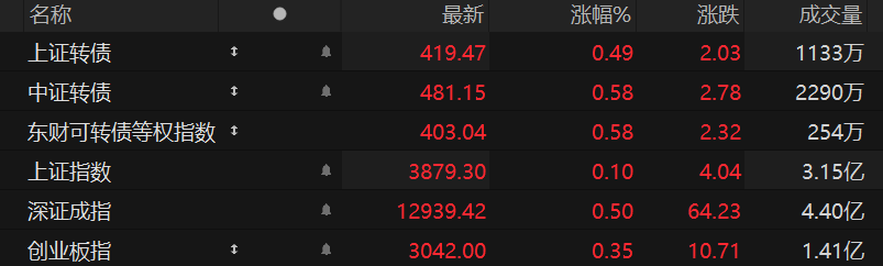 上文已经讲了,权益目前还是窄幅震荡,在缩量状态下,权益市场也没有明显的上攻意图,所以当前权益市场三大指数涨幅不算大。可转债今天终于回归正常了,不仅能跟随权益市场同步上涨,而且中没有明显的震荡,目前已经涨超权益指数了,中证转债和可转债等权指数涨幅都达到了0.58%,牢牢锁定大晴天。