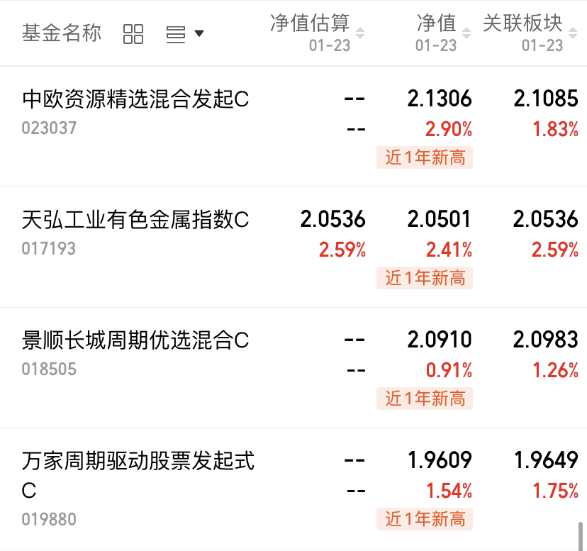 今天的赚钱效应继续延续,周期资源继续红起来,整体而言,今年的主线属于有色了。中欧资源精选混合上涨2.9%,$天弘工业有色金属指数C(OTCFUND|017193)$上涨2.41%,$景顺长城周期优选混合C(OTCFUND|018505)$上涨0.91%。