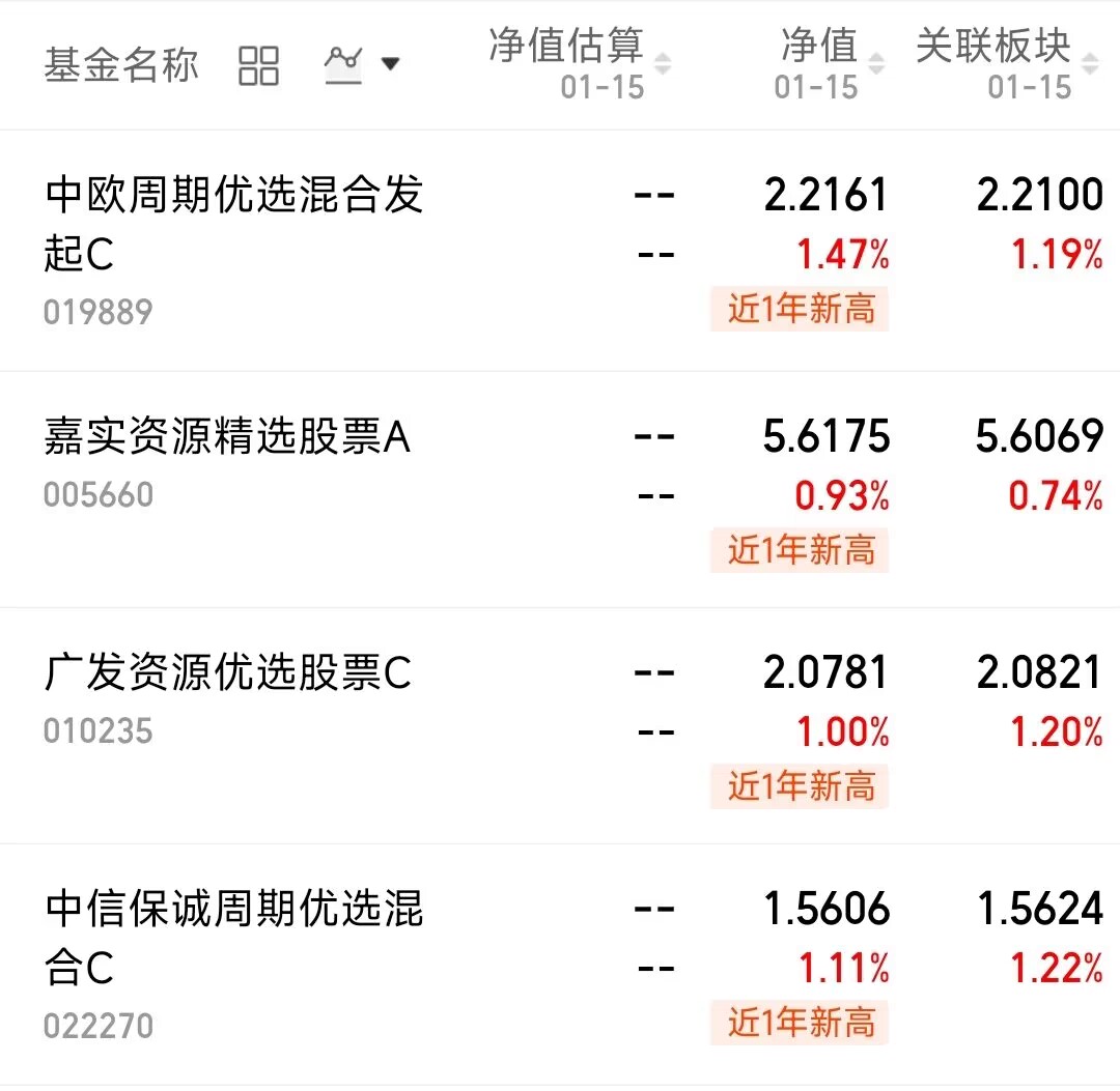 今日贵金属和小金属板块拉升上涨,核心驱动力就是金属价格上涨。这两个板块过去一年表现亮眼,整体都实现了翻倍上涨。背后是供需偏紧、全球宽松货币政策推升,还有新能源、AI 产业需求大增,$中欧周期优选混合发起C(OTCFUND|019889)$上涨1.47%,$嘉实资源精选股票A(OTCFUND|005660)$上涨0.93%,$广发资源优选股票C(OTCFUND|010235)$上涨1%,$中信保诚周期优选混合C(OTCFUND|022270)$上涨1.11%。