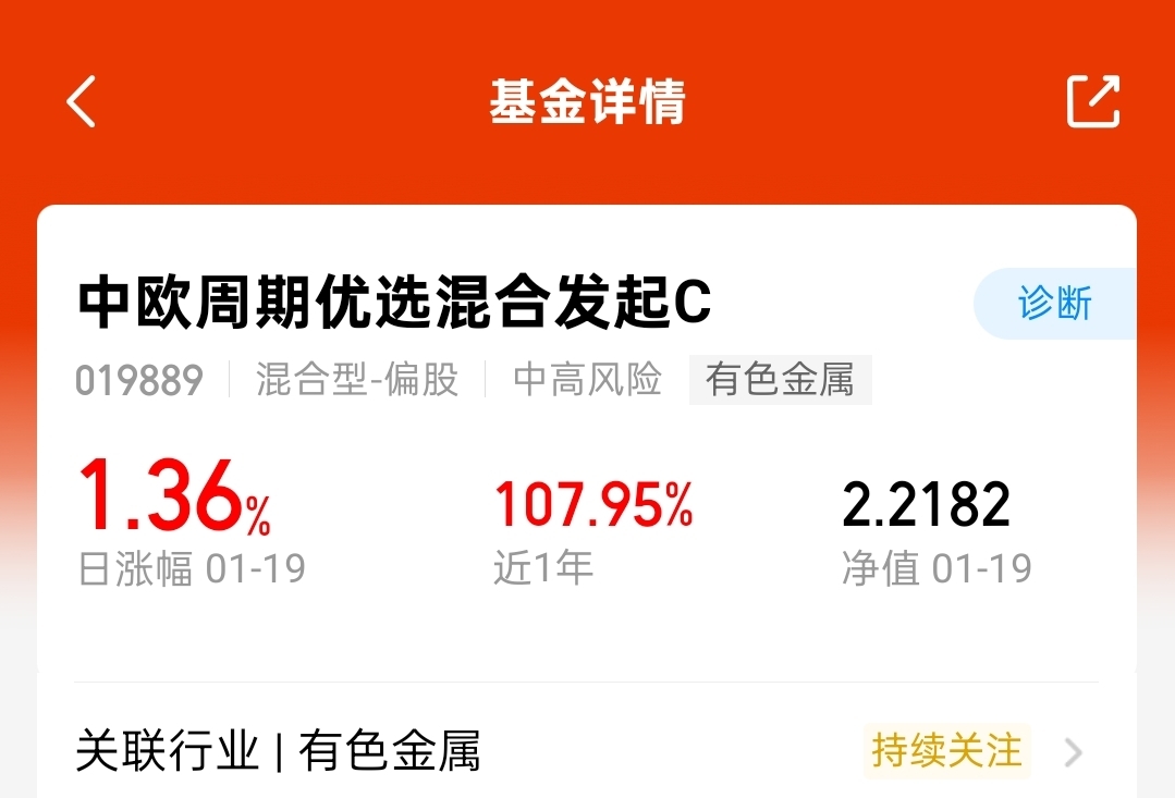 黄金和有色金属太强了!中欧周期优选混合发起C,涨1.36%,前十大重仓股包括华友