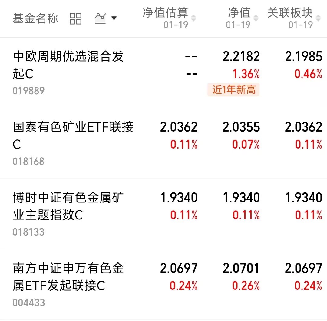 只要市场出现反弹,赚钱效应不错,那么有色板块一定会跟随着上涨,今天的有色板块继续跟随上涨,$中欧周期优选混合发起C(OTCFUND|019889)$上涨1.36%,$国泰有色矿业ETF联接C(OTCFUND|018168)$上涨0.07%,$博时中证有色金属矿业主题指数C(OTCFUND|018133)$上涨0.11%,$南方中证申万有色金属ETF发起联接C(OTCFUND|004433)$上涨0.26%。