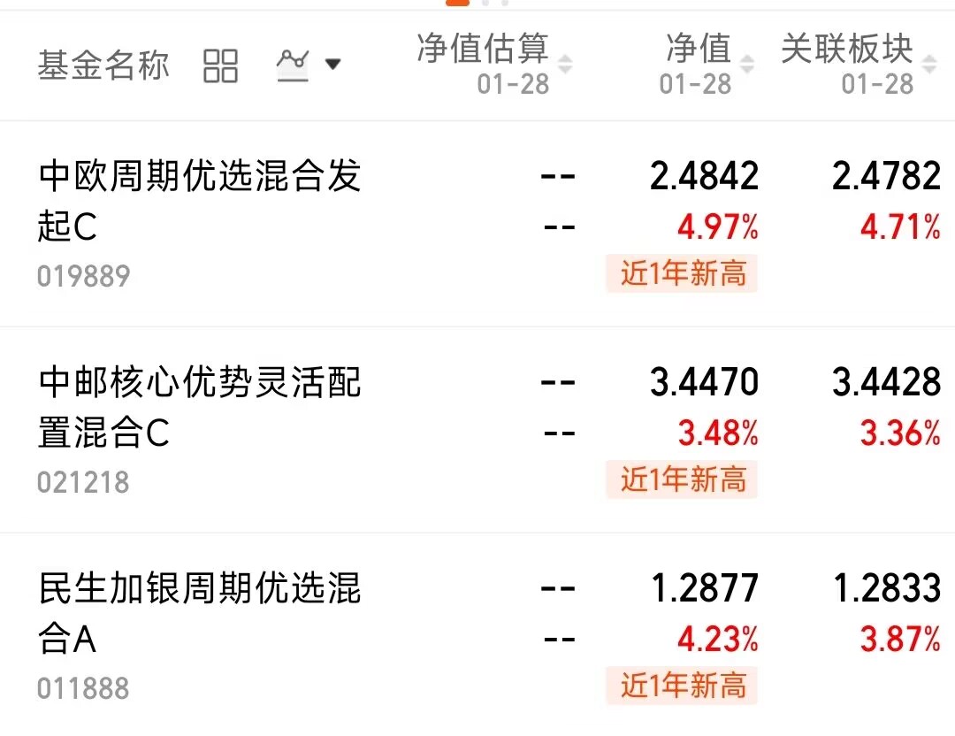 今日盘面分化明显,黄金和有色等顺周期板块集体大涨,核心逻辑就是涨价驱动。不管是国际大宗商品的价格波动,还是国内的供需关系变化,$中欧周期优选混合发起C(OTCFUND|019889)$上涨4.97%,$中邮核心优势灵活配置混合C(OTCFUND|021218)$上涨3.48%,$民生加银周期优选混合A(OTCFUND|011888)$上涨4.23%。
