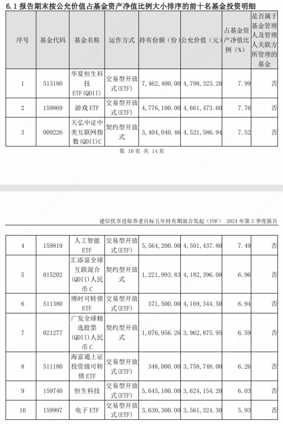 组合持仓上能够看到,建信优享进取养老目标五年持有期混合发起(FOF)Y多是ETF,包含A股、港股、美股多元化市场标的。如其重仓的汇添富全球移动互联混合(QDII)人民币C、广发全球精选股票(QDII)人民币C均配置了微软、英伟达等股票,同时还配置了广发纳斯达克100ETF。