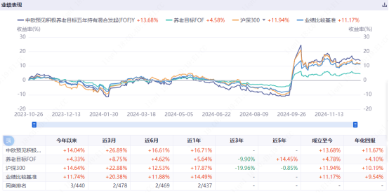 从各阶段(近3月、近6月、近1年、今年以来)业绩中能看到,中欧预见积极养老目标五年持有混合发起(FOF)Y都拿下了同类第二,表现持续优秀。(同类基金指养老目标FOF,数据来源iFinD,截至2024/12/23)