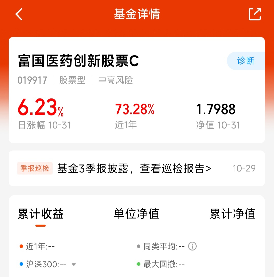 经过前期深度回调,创新药板块估值已进入更具性价比的区间。$富国医药创新股票C$ 该基金昨日净值大幅上涨6.23%,今日估值继续上扬1.55%,表现相当抢眼。从中长期表现来看,近三个月累计上涨34.23%,近六个月更是实现了73.28%的可观涨幅,业绩表现相当出色。