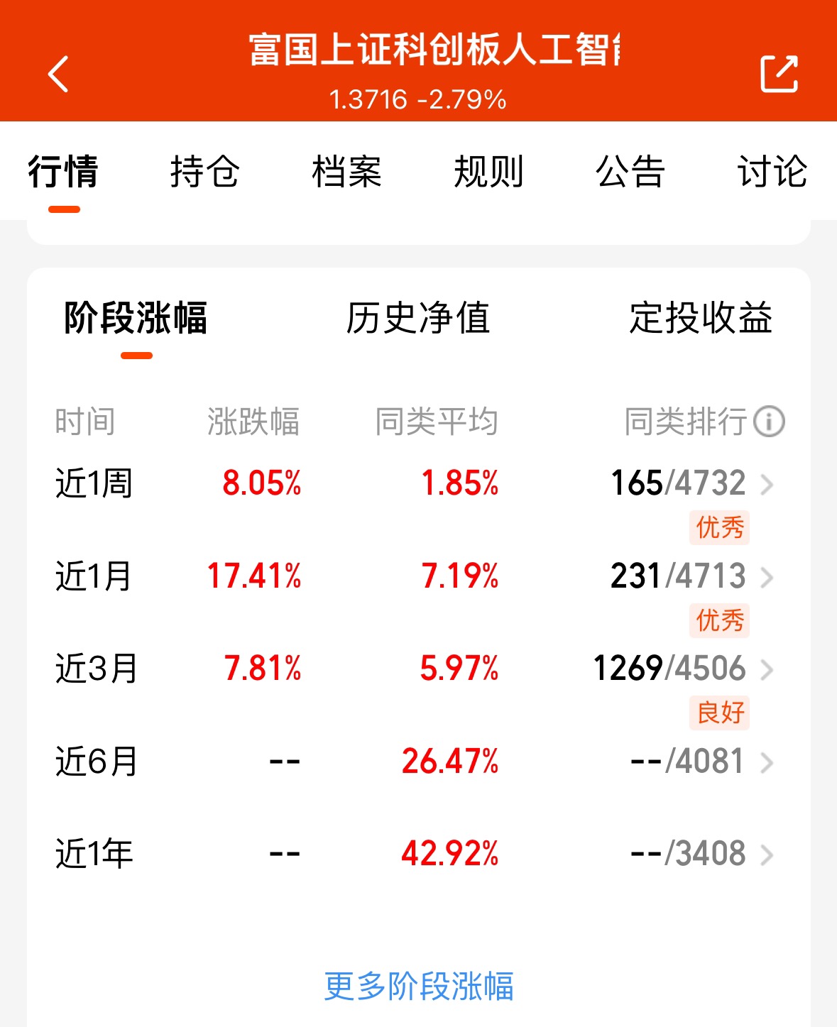 2026 硬科技投资风向标!富国上证科创板人工智能 (024764) 今日估值飙超 5%,近 6 个月涨 37.16%!聚焦科创板 AI 全产业链,95% 跟踪指数成份股,重仓龙头企业,精准捕捉行业红利。当前 AI 技术迭代加速,多模态大模型商业化落地,智能体应用场景扩容,叠加政策支持高端芯片突破,国产替代浪潮来袭,这只基金将充分受益于行业景气度攀升,上涨动力强劲!