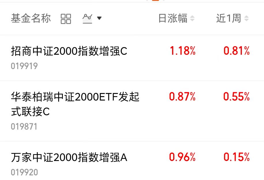 $华泰柏瑞中证2000ETF发起式联接C(OTCFUND|019871)$近一周上涨0.55%$万家中证2000指数增强A(OTCFUND|019920)$近一周上涨0.15%