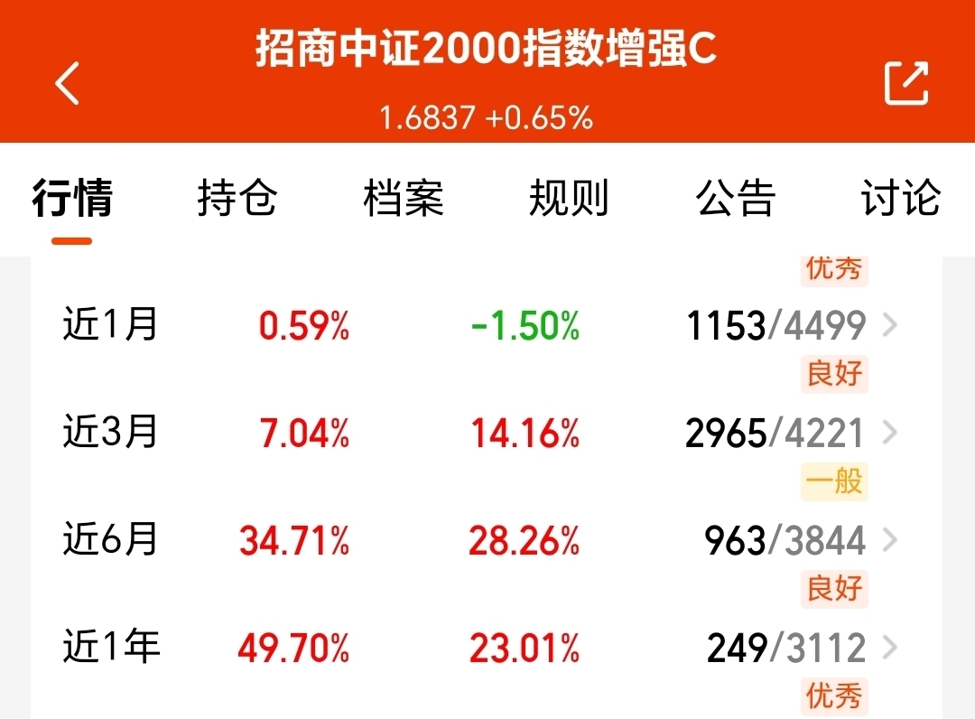 A股板块轮动加速,中证2000指数凭借小微盘风格与均衡行业分布脱颖而出,年内涨幅亮眼。$招商中证2000指数增强C$不仅精准跟踪指数,而且叠加量化增强策略,近12个月收益达49.70%,超额收益显著。