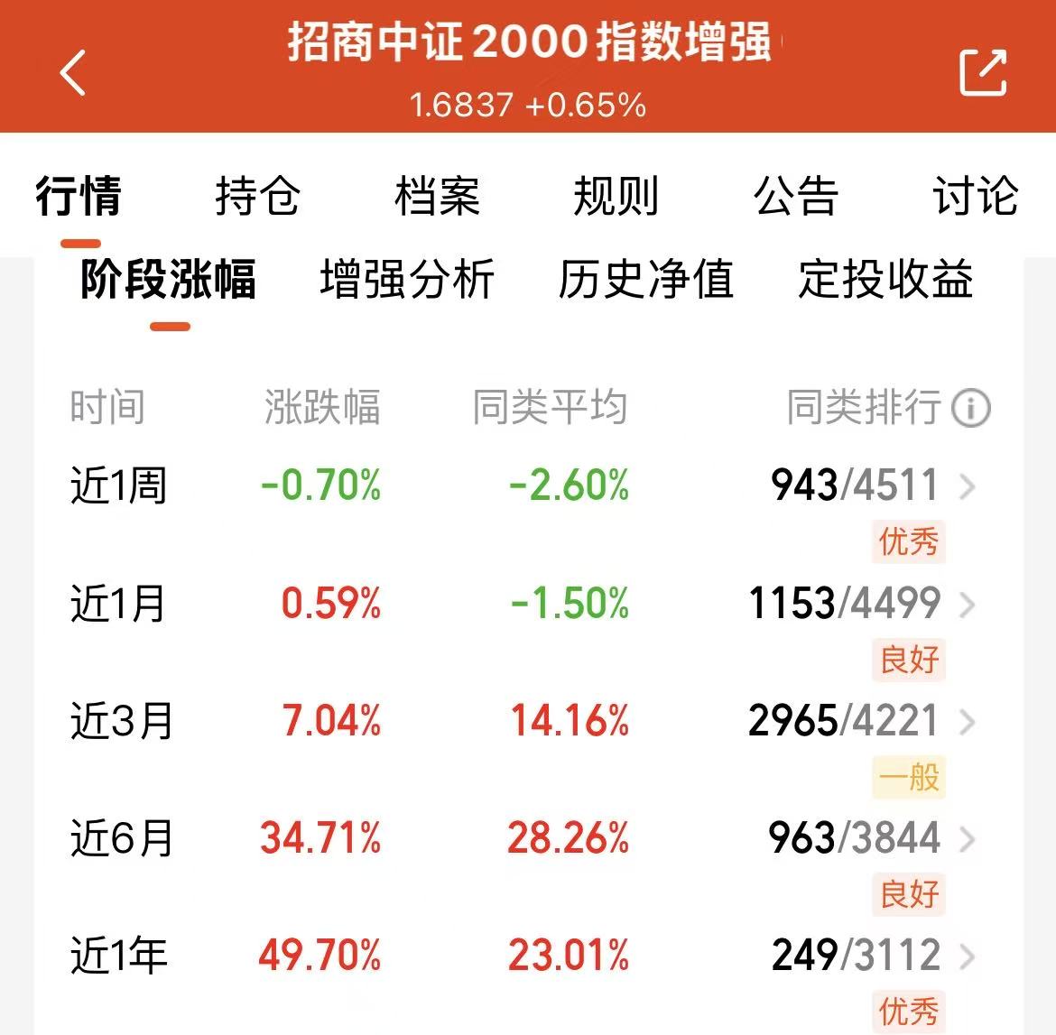 今天大盘上涨啦,最近波动大,单一赛道比较难,不过我发现宽基还是不错的,$招商中证2000指数增强C(OTCFUND|019919)$是聚焦中小盘成长股的,重仓有豪鹏科技、炬芯科技等龙头,近六个月涨幅34.71%,近一年涨幅49.7%,业绩优秀,盈利强,回撤也不错,我也打算布局起来。$申万菱信国证2000指数增强型发起式A(OTCFUND|015921)$ #A股低开高走!国际资本看好中国资产#