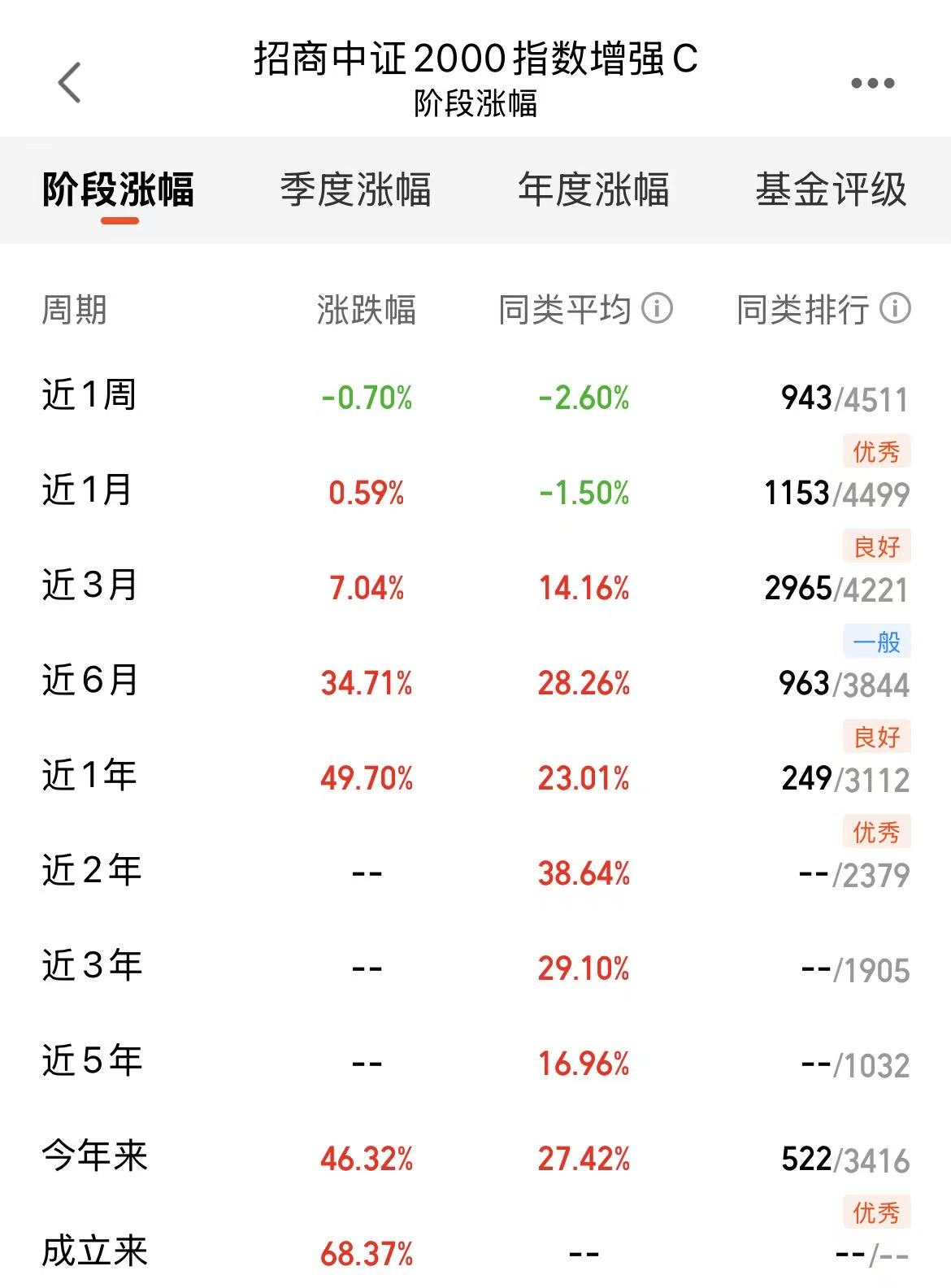最近的大盘波动比较大,我也是亏损了挺多,反观看小盘股回撤还是比较小的,收益也不错,中小盘科技制造企业还获得税收优惠、资金支持。$招商中证2000指数增强C(OTCFUND|019919)$持仓新能源、半导体等热门板块,业绩优秀,近一年收益率49.7%,我觉得长期持有不错的。$万家中证2000指数增强A(OTCFUND|019920)$ #4000点 到底要不要止盈?#