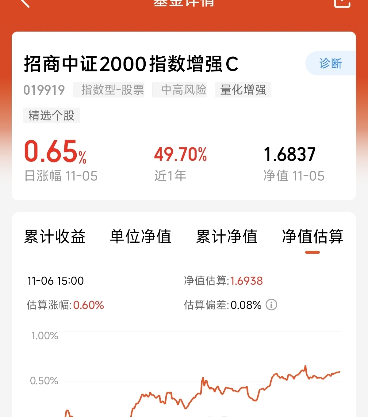 $招商中证2000指数增强C$ 这只不一样的指数基金。紧跟中证2000指数的同时,还采用量化的策略来增强收益。增强部分的灵活配置。哪里有热点就追踪哪里。最近来的表现也是非常给力。昨天上涨了0.65%。同类涨幅继续做到了领先。今天尾盘再度拉升。看来马上又要突破了。期待继续创新高。