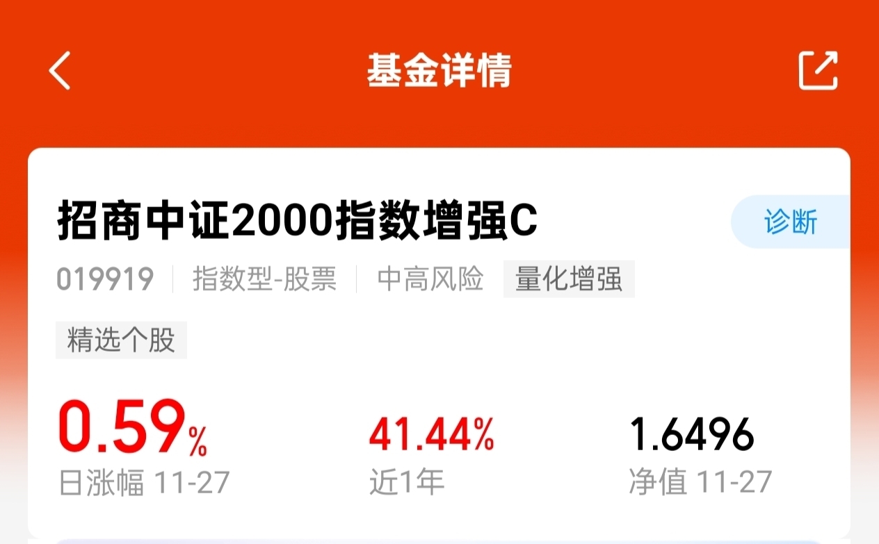 招商中证2000指数增强C(OTCFUND|019919)昨天涨了0.59%,最近一周累计涨0.27%